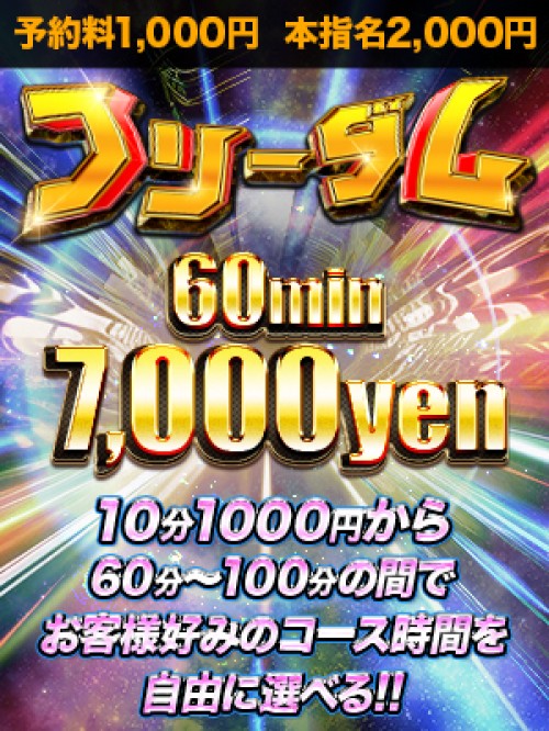 フリーダム イベントに 新しい試みを毎日オールタイム開催 60min⇒7000円 10minにつき+1000円 60min~100minまでご自由に 初回御予約料+1000円 本指名様御予約料+2000円 大阪府内屈指の老舗グループの中でも 採用基準やサービス面また適正な特別指名料 を徹底し 安物買いの銭失いを払拭した お値段以上エコ京橋!!