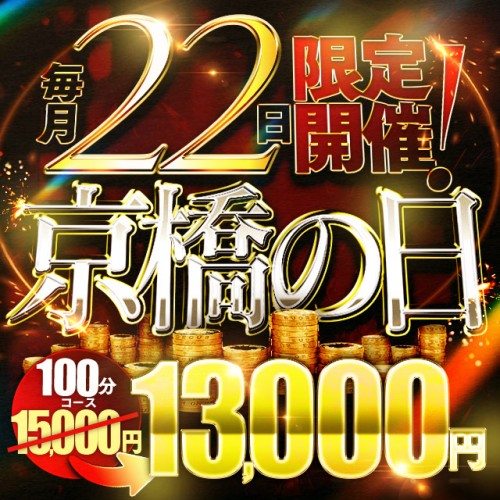 毎月22日限定! ご新規様も会員様も、 通常 100分コース15000円のところ、 100分コース13000円でのご案内 京橋店限定のイベントです! お得な機会にぜひご利用ください!