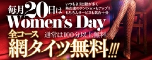 毎月20日は Women's Day開催! お客様の料金はいつもと一緒ですが・・・・ ココが違うっ! ↓ 普段 通常は100分以上無料 ↓ 全コース網タイツ無料! これを逃す手はナイゼっ! 会員様もご新規様もお待ちしております! ご予約の際、網タイツ無料!と仰ってください!!