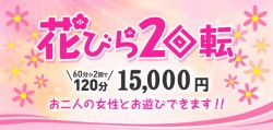 花びら回転イベント 『今日は二人の奥様にお相手願いたいなぁ・・・』そのようなお客様に朗報です。 通常60分コースを2回お遊びいただく場合は20,000円ですが、 5,000円割引の15,000円でお遊びをご提供いたします。 ※特別割引コースの為 土・日・祝日は対象外で御座います。
